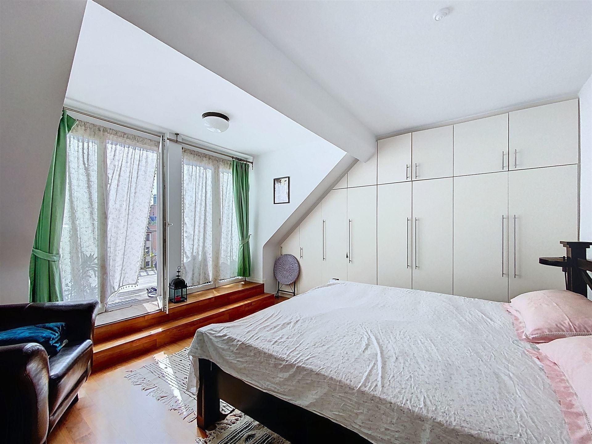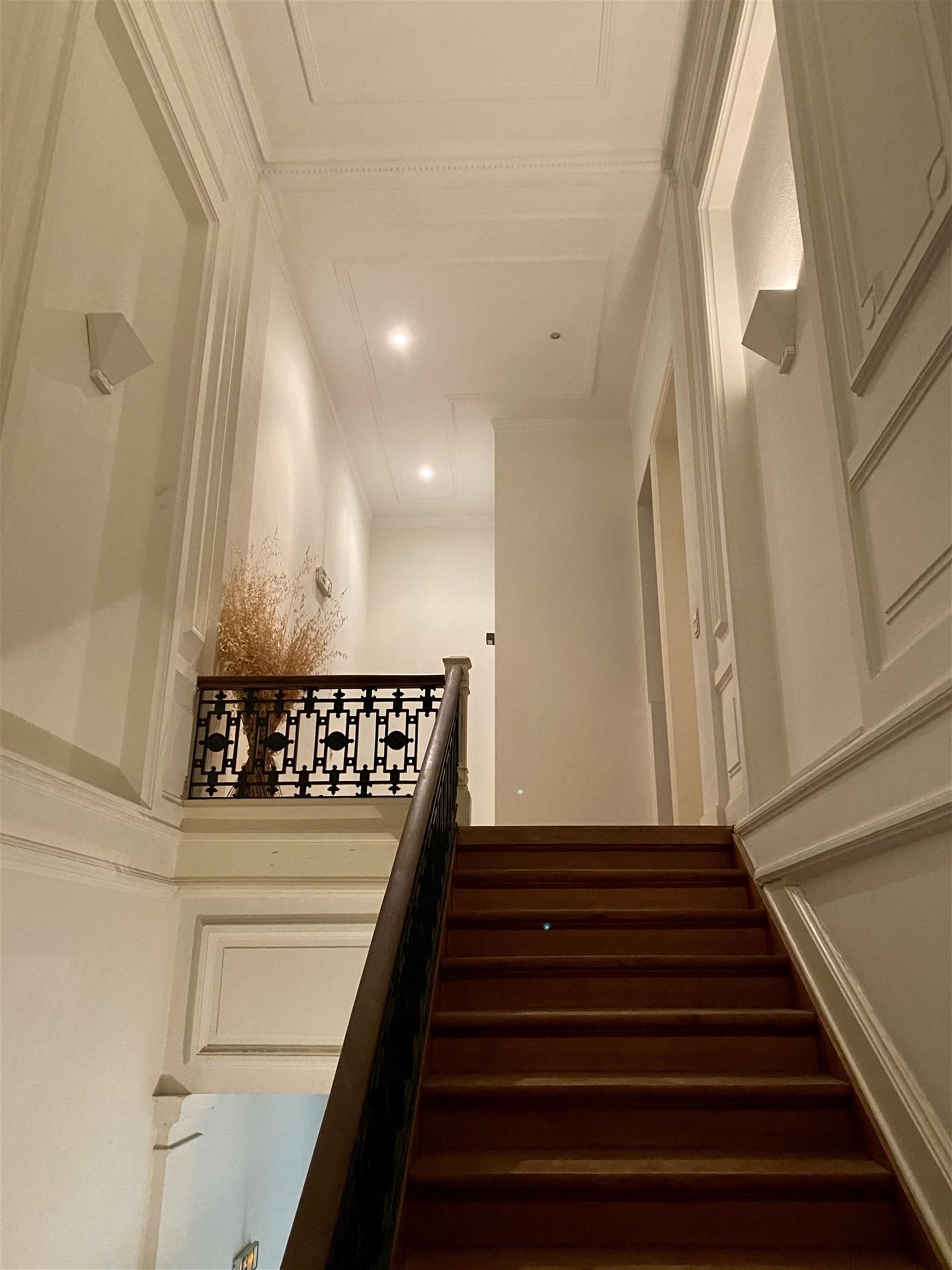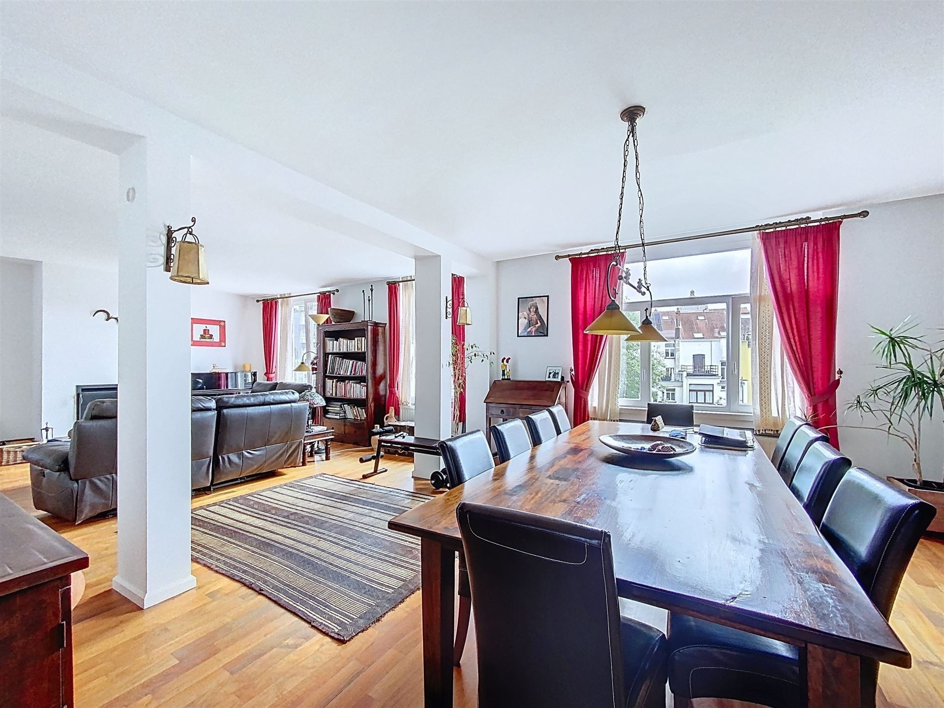 Lumineux duplex penthouse de 197m2 net habitables + terrasses aménagé dans un large Hotel de Maître avec porte cochère. Des grandes réceptions avec cuisine américaine, 4 chambres, 2 salles de bain. Une complète rénovation et transformation de 2004. Petite co-propriété avec ascenseur. L'appartement se situe au troisième et quatrième étage et est agrémenté d'un emplacement de voiture et cave. Comprenant : Premier niveau - troisième étage : Hall d'entrée avec wc séparé et vestiaire. Ascenseur avec accès direct à l'appartement. Des réceptions avec parquet en L de +/- 90m2 comprenant, deux espaces séjour, dont un avec feu ouvert et accès à une premier terrasse. Salle à manger et cuisine américaine super équipée. Chambre de +/- 16m2 avec salle de douche. Deuxième niveau - quatrième étage Chambre de Maître avec placards de +/- 17m2 donnant accès à la grande terrasse de 30m2 Salle de bain avec double lavabo, bain et douche, et wc. 2 autres chambres de +/- 15 et 12m2. Espace chaufferie. Divers : Grande cave de +/- 20m2 Un emplacement de voiture dans la cour arrière ( accès via porte cochère ) Nouvelle chaudière à condensation Vaillant Ecotec Plus VC 306