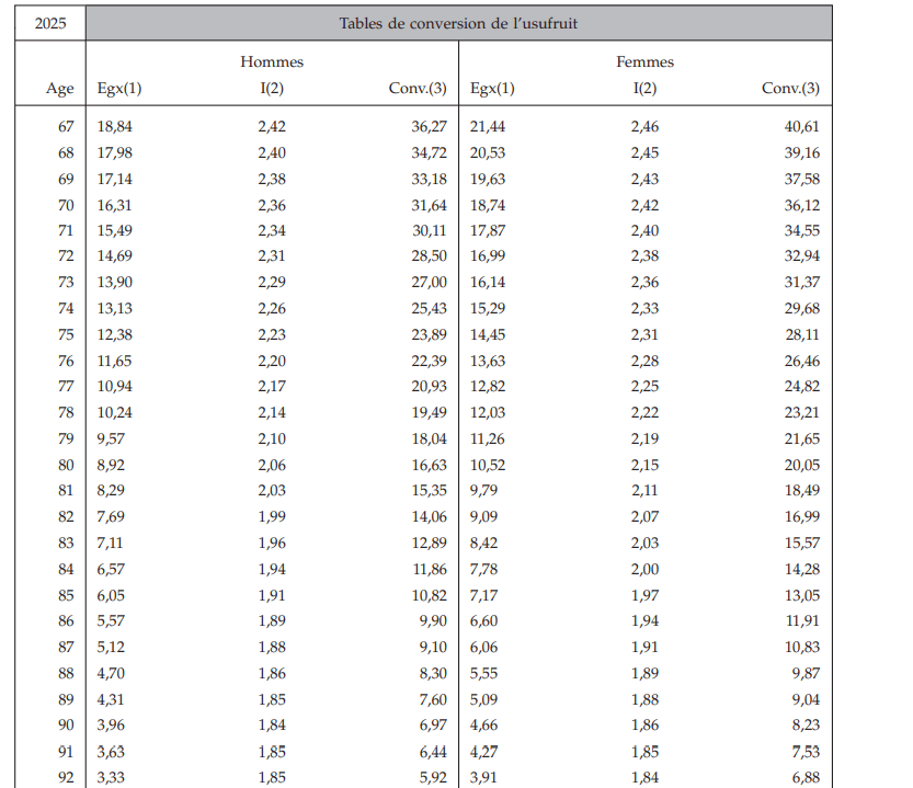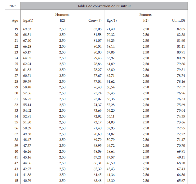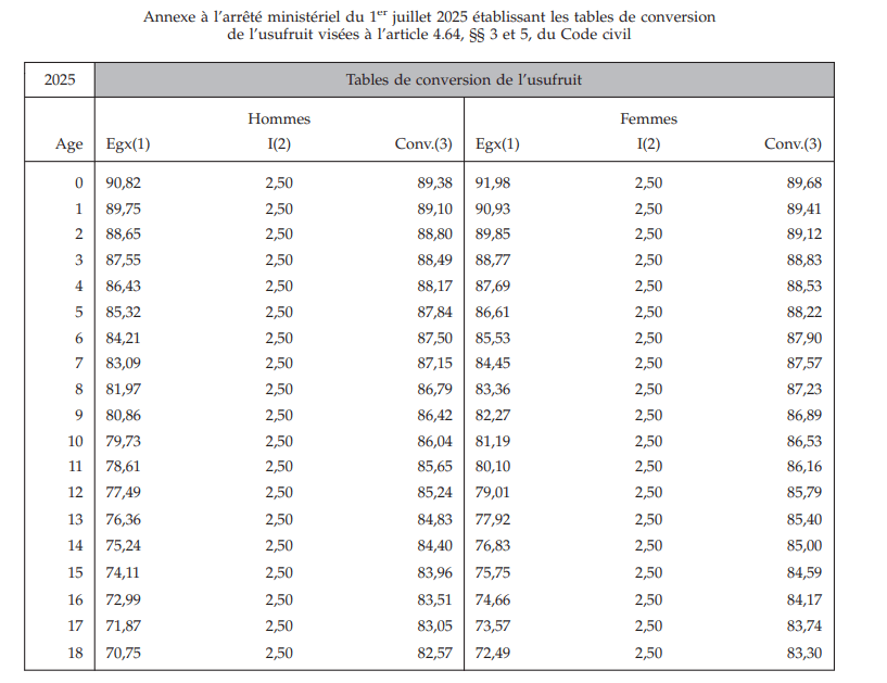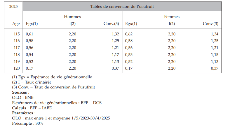 Les tables de conversion de l’usufruit pour 2025 ont été publiées dans le Moniteur belge le 1er juillet 2025 . Elles permettent de convertir la valeur estimée de l’usufruit d’une manière uniforme en un montant d’argent.